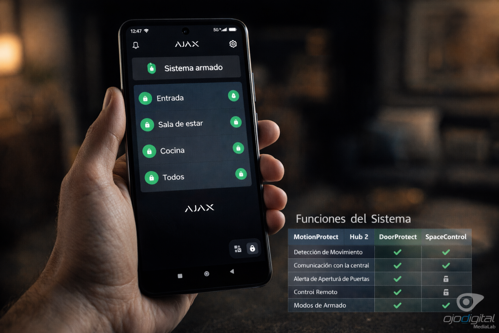 La app Ajax (iOS y Android) permite armar y desarmar el sistema en particiones separadas —por ejemplo, armar solo la zona exterior mientras se duerme, sin activar los sensores de movimiento interiores. Muestra el nivel de batería de cada dispositivo, la intensidad de señal, el historial de eventos, temperatura ambiente (en detectores compatibles) y permite agregar usuarios con distintos niveles de permiso.